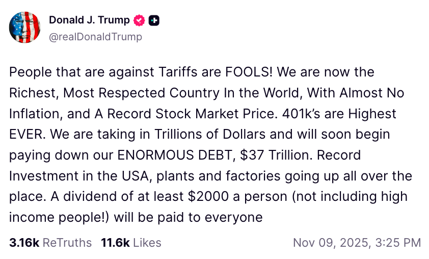 Trump’ın uluslararası tarifelerine bağlı olan bu ödeme, Truth Social’daki bir gönderide duyuruldu.
